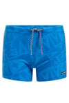 Normal geschnittene Badehose mit Camouflage-Muster, seitlichem Aufdruck, gefütterter Front und elastischem Bund mit Tunnelzug.