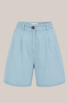 Ein Kleidungsstück, das man jeden Sommer tragen kann. Diese Denim-Shorts mit hoher Taille hat weite Hosenbeine und eine geschmeidige Silhouette, einen Reißverschluss und Knopfverschluss, zwei Seitentaschen und dezente Falten für zusätzliche Bewegung.