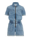 Dieser Denim-Jumpsuit aus einer weichen Baumwollmischung hat einen normalen Kragen, kurze Ärmel und zwei Brusttaschen. Ein Reißverschluss, ein Gummizug in der Taille und praktische Taschen machen diesen Jumpsuit zu einer bequemen und vielseitigen Wahl.
