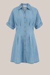 Ein Outfit, das sich von selbst regelt. Dieses Kleid hat eine gerade Passform mit Kragen und V-Ausschnitt, kurze Ärmel mit umgeschlagenem Bündchen und eine durchgehende Knopfleiste. Plisseefalten vorne und ein ausgestellter Saum geben Raum.