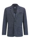 Ein schmal geschnittener Blazer aus einer recycelten Polyestermischung mit Stretch-Anteil, einem Knopfverschluss und Struktur. Das Sakko hat einen Smoking-Kragen und lange Ärmel. Der Blazer hat zwei aufgesetzte Taschen auf der Vorderseite und eine Brusttasche, deren Innenfutter als Einstecktuch getragen werden kann.