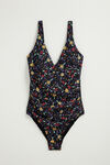Eng anliegender Badeanzug aus recyceltem Polyamid mit Muster und verstellbaren Trägern. Der Badeanzug hat einen V-Ausschnitt, seitlichen Raffungen zur Betonung der Taille und ein figurkorrigierendes Futter.