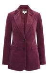 Ein normal geschnittener Blazer aus Cord mit zwei Knöpfen und zwei Pattentaschen. Das Modell hat einen normalen Kragen und lange Ärmel.