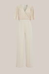 Mit normaler Passform, V-Ausschnitt und kurzen Ärmeln. Das Oberteil ist halbtransparent mit Struktur und mit transparenten Pailletten besetzt. Die Hose ist einfarbig mit breiten Beinen, einer Nahtlinie auf der Vorderseite und hat eine feine Struktur. Hat einen Reißverschluss auf der Rückseite.
