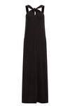 Ein Maxikleid aus einer Seidenmischung mit einer Knopfleiste. Das Modell hat einen drapierten Ausschnitt und fällt bis zu den Knöcheln.