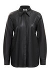 Eine Kunstlederbluse in normaler Passform mit verdecktem Knopfverschluss. Das Modell hat einen normalen Kragen und lange Ärmel.