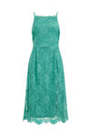 Ein eng anliegendes Spitzenkleid mit offenem Rücken und Schleifenverschluss. Es hat einen quadratischen Ausschnitt, Spaghetti-Träger und einen verdeckten Reißverschluss. Das Kleid reicht bis übers Knie.