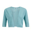 Een regular fit vestje van een viscosemix met glittergaren. Het model heeft een sjaalkraag en korte mouwen.