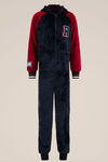 Normal geschnittener Anzug aus Teddyfleece mit langen Ärmeln, Kapuze mit Applikationen, Reißverschluss, zwei Eingrifftaschen, und langem Hosenbein.