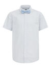 Dieses schmal geschnittene Hemd besteht aus einer Baumwollmischung und ist mit einem Muster, einer Brusttasche und einer Knopfleiste versehen. Ein normaler Kragen, eine abnehmbare Fliege und kurze Ärmel vervollständigen das Modell.