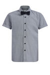 Schmal geschnittenes Hemd aus weichem Baumwollgewebe mit abnehmbarer Fliege, klassischem Hemdkragen, Knopfleiste und kurzen Ärmeln. Der Saum ist leicht abgerundet. Die Fliege ist mit einem Gummiband und Kunststoffverschluss versehen.