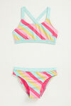 Vollständig gefütterter Bikini mit Tiermuster und elastischem Bund, Unterbrustbändchen und überkreuzten Trägern mit Streifen-Detail.