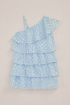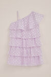 Ein festlicher Look, bereit zu glänzen. Dieses One-Shoulder-Kleid hat eine normale Passform und ist kurz geschnitten. Das Kleid ist durchgehend mit silbern schimmernden Fäden verarbeitet, hat ein volantartiges Detail von oben bis unten und einen schmalen Schulterriemen an der gegenüberliegenden Schulter.