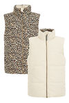 Beidseitig tragbare ärmellose Weste mit zwei unterschiedlichen Seiten. Eine Seite in gemusterter Stepp-Optik, die andere einfarbig. Ausgestattet mit Reißverschluss mit Kinnschutz und zwei Eingrifftaschen.
