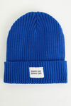 Strick-Beanie aus Acryl-Mix mit Aufnäher und weichem Fleecefutter.
