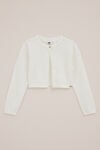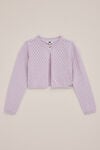 Zum Verlieben. Die durchbrochene Strickjacke hat einen Rundhalsausschnitt, Strickbündchen an Ärmeln und Saum und wird oben mit einem Herzknopf geschlossen. Weich, zart und perfekt, um es über allem zu tragen.