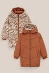 Zwei Looks, ein Modell. Diese wasserabweisende Steppjacke ist wendbar - so lässt sie sich bequem umdrehen und auf links tragen. Das gefütterte Modell hat eine glatte Seite und eine Seite aus Kunstfell mit Muster. Außerdem hat sie einen Reißverschluss mit Kinnschutz, eine praktische Kapuze, zwei Seitentaschen mit Druckknöpfen und lange Ärmel mit Rippbündchen.