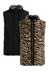Beidseitig tragbare ärmellose Weste mit zwei unterschiedlichen Seiten. Eine Seite in modischer Stepp-Optik, die andere aus weichem Kunstfell. Die Jacke hat einen Reißverschluss mit Kinnschutz und zwei Eingrifftaschen.