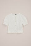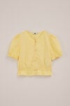 Sie hat eine normale Passform, einen V-Ausschnitt, einen Knopfverschluss mit gestickten Blumen auf den Knöpfen, kurze Ärmel mit elastischen Bündchen und einen elastischen Saum der Bluse. Hat überall strukturierte Kreise.