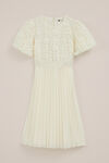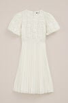 Ein leichter Look mit einem fröhlichen Finish. Das Kleid hat eine normale Passform, einen Rundhalsausschnitt und kurze Ärmel mit elastischen Bündchen. Das Oberteil besteht aus halbtransparentem Stoff mit einer Allover-Textur aus aufgestickten Blumen und hat einen Reißverschluss am Rücken. Der Rock besteht aus einer plissierten Oberlage und einem weichen Unterrock.