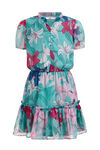 Normal geschnittenes Kleid aus fein gewebtem Material mit Muster und Knopfverschluss. Ausgestattet mit rundem Ausschnitt, kurzen Ärmeln und Rüsche am Saum.
