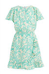 Normal geschnittenes Kleid aus recyceltem Polyester mit Muster und Rüschen. Das Modell hat einen V-Ausschnitt mit Druckknopfverschluss und kurze Ärmel. Das Kleid hat einen falschen Overlay-Effekt und einen Gummizug in der Taille.