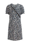 Normal geschnittenes Kleid aus fein gewebtem Material mit Muster und Rüschen. Ausgestattet mit V-Ausschnitt und kurzen Ärmeln.