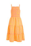 Ein normal geschnittenes Baumwollkleid mit einem gemusterten und gesmokten Oberteil. Das Modell hat verstellbare Spaghetti-Träger und einen Volant am unteren Saum.