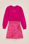 Verwöhne deine Kinder mit Stil! Dieses gemusterte Kleid in normaler Passform besteht aus einer Baumwollmischung und hat ein elastisches Taillenband mit Glitzergarn und Rüschen. Ein Rundhalsausschnitt und lange Ärmel runden dieses modische Modell ab.
