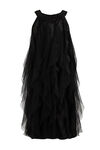 Normal geschnittenes Kleid aus fein gewebtem Material in glänzender Satin-Optik mit Rüsche und Rundhalsausschnitt mit Pailletten und Knopf.