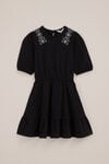 Niedlich, luftig und bereit für Sommerabenteuer. Dieses Seersucker-Kleid hat eine normale Passform, einen Rundhalsausschnitt, kurze Ärmel mit elastischen Bündchen, einen elastischen Bund und eine kurze Gesamtlänge. Auf den Schultern befinden sich rautenförmige Stickereien und der Stretch-Anteil macht das Kleid besonders bequem.
