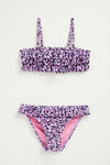 Vollständig gefütterter Bikini mit durchgehendem Leopardenmuster. Das Oberteil hat verstellbare Träger und einen Kunststoffverschluss am Rücken. Höschen und Oberteil sind mit Rüschen verziert.