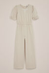 Luftig, verspielt und voller fröhlicher Details. Dieser Seersucker-Jumpsuit hat eine normale Passform, einen Rundhalsausschnitt sowie kurze Ärmel mit elastischem Saum und Bund und geraden Beinen. Auf der Brust und den Ärmeln befinden sich rautenförmige Stickereien und Stretch sorgt für zusätzlichen Komfort und Bewegungsfreiheit.