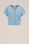 Denim, aber dann für oben. Dieses Baumwolltop mit V-Ausschnitt und kurzen Ärmeln ist sommerlich und sieht mühelos stylisch aus. Mit der Knopfleiste bekommt das Modell etwas mehr Struktur.