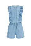 Dieser Denim-Jumpsuit in normaler Passform besteht aus Baumwolle und zeichnet sich durch ein verspieltes Muster und trendige Rüschen aus. Gerade Beine, ein Gummizug in der Taille und ein praktischer Druckknopfverschluss runden das Modell ab.