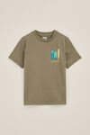 Normale Passform, Rundhalsausschnitt und kurze Ärmel. Es hat einen kleinen Aufdruck mit Surfbrettern auf der linken Brust und diesen vergrößert am Rücken.