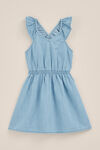 Das Kleid hat eine normale Passform und einen V-Ausschnitt, besteht aus 100% Baumwolle und ist ärmellos. Hat dünne Schulterträger mit quer verlaufenden Rüschen am Rücken. In der Taille ist ein breiter Gummizug und der Rockteil beginnt ab der Taille in Falten.