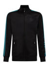 Normal geschnittene Sweatjacke aus recyceltem Polyester mit Colourblock-Design, langen Ärmeln, Reißverschluss mit Kinnschutz und zwei Zippertaschen auf der Vorderseite.