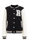 Normal geschnittene Bomberjacke aus Baumwolle mit Stickereinen, Druckknopfverschluss und zwei Eingrifftaschen. Das Modell hat einen runden Ausschnitt und kontrastierende lange Ärmel.