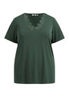 Oberteil aus fein gewebtem Material mit kurzen Ärmeln und V-Ausschnitt mit Spitze.
