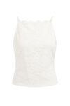 Ein eng anliegendes Spitzentop mit offenem Rücken und Schleifenverschluss. Das Top hat einen eckigen Ausschnitt und Spaghettieträger.
