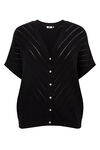 Normal geschnittene Strickjacke aus Bio-Baumwolle mit Ajourmuster und Knöpfen. Ausgestattet mit V-Ausschnitt und kurzen Ärmeln.