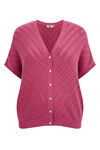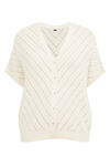 Normal geschnittene Strickjacke aus Bio-Baumwolle mit Ajourmuster und Knöpfen. Ausgestattet mit V-Ausschnitt und kurzen Ärmeln.