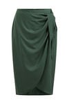 Midirock aus fein gewebtem Material mit elastischem Bund, angedeuteter Wickeloptik mit breiten seitlichen Bindebändchen und Rüsche auf der Vorderseite. Ungefüttert.