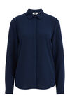 Eine Bluse in normaler Passform aus recyceltem Polyester mit einem Muster und verdecktem Knopfverschluss. Das Modell hat einen normalen Kragen und lange Ärmel.