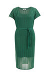 Normal geschnittenes Kleid aus Viskose-Mix mit eingearbeitetem Glitzergarn, mit Lochmuster und Bindegürtel. Ausgestattet mit rundem Ausschnitt und kurzen Ärmeln. Das Kleid reicht bis übers Knie.