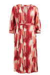 Normal geschnittenes Kleid aus gemusterter Viskose mit Bindegürtel. Das Modell hat einen V-Ausschnitt, lange Ärmel und einen Seitenschlitz.