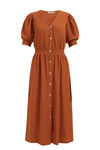 Ein normal geschnittenes Kleid in Jersey-Qualität mit strukturiertem Stoff und Knopfverschluss. Ausgestattet mit V-Ausschnitt und kurzen Ärmeln. Das Kleid reicht bis übers Knie.
