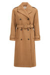 Ein eng anliegender Mantel aus einer Wollmischung mit einem doppelten Knopfverschluss, Gürtel und zwei Seitentaschen. Das Modell hat eine Innentasche, einen Schlitz auf der Rückseite und Details an den Schultern.