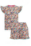 Ein Combo-Set in normaler Passform aus einem gemusterten Baumwoll-Mix mit Rüschen. Das Herren-T-Shirt hat einen runden Ausschnitt und kurze Ärmel. Die Shorts haben gerade Hosenbeine und einen Gummizug in der Taille.
